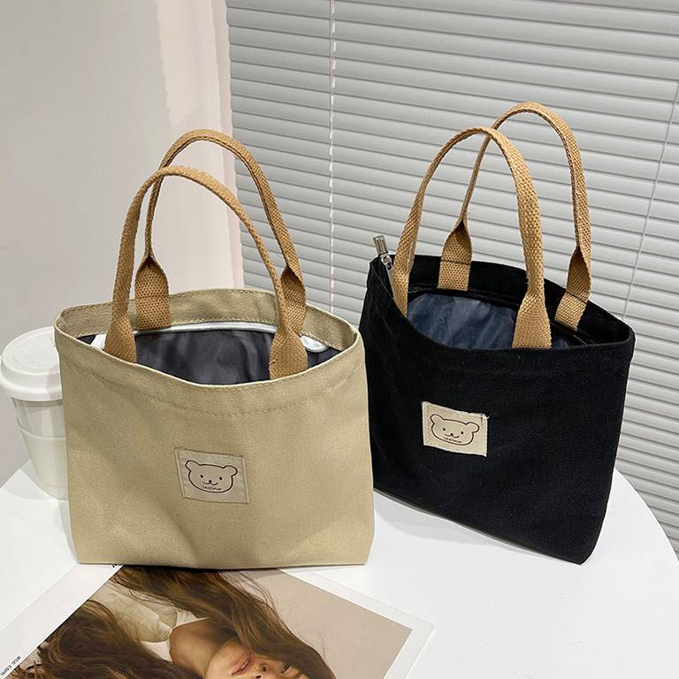 愛らしいくまパッチ付きミニトートバッグ ランチバッグ風 シンプルキャンバスバッグ レディース バッグ 小さめ 手提げ 韓国風 大人可愛い カジュアル 通勤通学 春夏 秋冬 使いやすい 4色展開 K-B0182