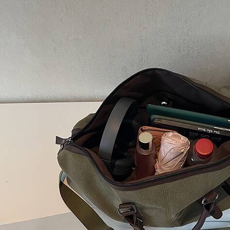 旅行や出張など多くの荷物が必要なシーンにぴったりの、大容量キャンバスボストンバッグ。帆布素材を使用しており、軽量でありながら丈夫さも兼ね備えた設計。手持ち・肩掛け・斜め掛けと3WAYで使用できる実用性の高さも魅力です。