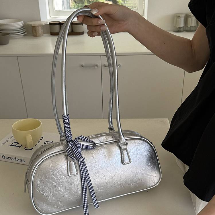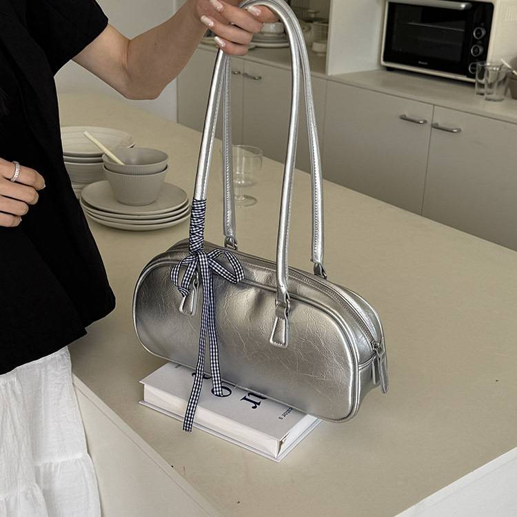 華やかな光沢感が目を引くシルバーカラーのショルダーバッグ。程よいコンパクトサイズでデイリーユースに最適ながらも、エレガントなシルエットがコーデのアクセントになります。可愛らしいチェックリボンがワンポイントになり、さりげない甘さを演出します。