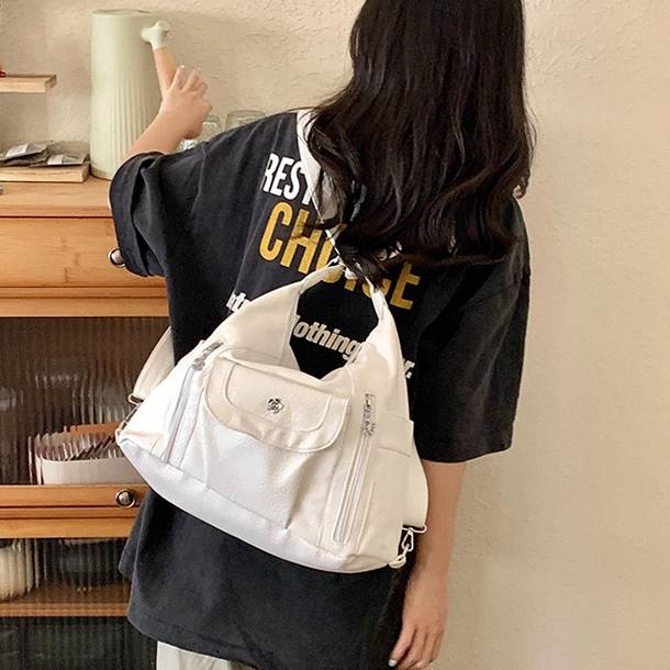 ブラックとホワイトのベーシックな2色展開で、どんなコーデにも合わせやすく、シーズンを問わず使える万能バッグです。ショルダー紐は調節可能で、斜めがけ・肩掛けの2WAYスタイルが楽しめます。軽量かつ柔らかいフェイクレザー素材で、長時間持ち歩いても負担が少ないのも魅力。
