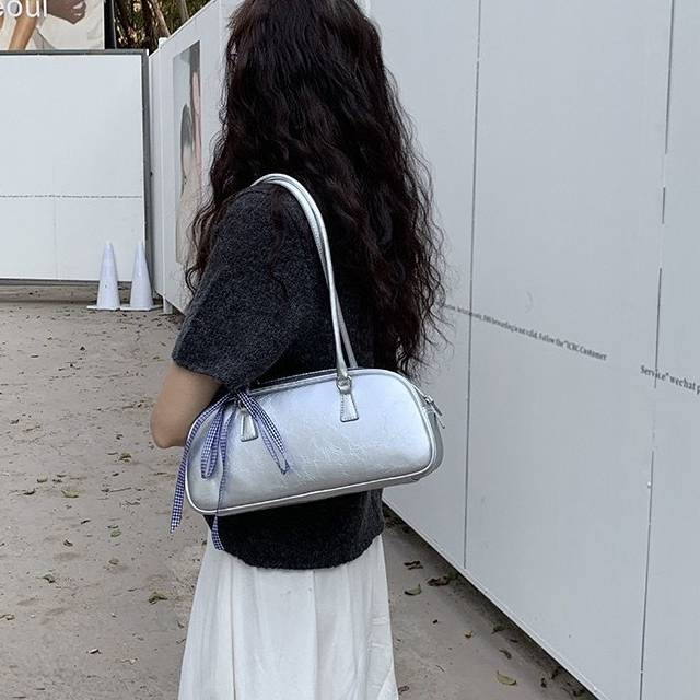 華やかな光沢感が目を引くシルバーカラーのショルダーバッグ。程よいコンパクトサイズでデイリーユースに最適ながらも、エレガントなシルエットがコーデのアクセントになります。可愛らしいチェックリボンがワンポイントになり、さりげない甘さを演出します。