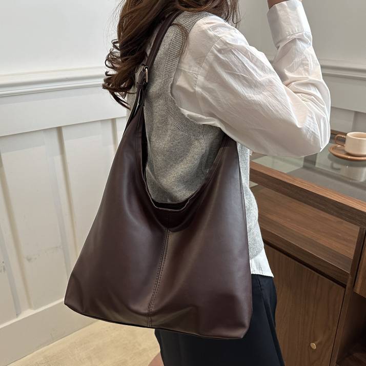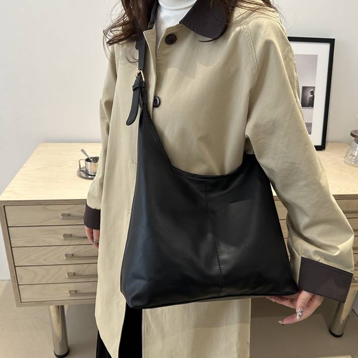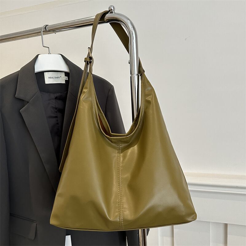 高見えPUレザーとミニマルデザインが魅力の、大容量ワンショルダーバッグ。シンプルながらも曲線的なフォルムが女性らしく、洗練された雰囲気を演出します。しっかり収納力もあるので、通勤・通学・お出かけなど幅広いシーンに対応。