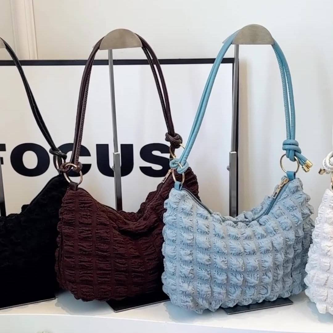 肌触り抜群のふわふわ生地が魅力のワンショルダーバッグ。表面は立体的な格子模様で、シンプルながら個性をプラス。カジュアルからフェミニンなコーデまで幅広くマッチする万能アイテムです。
