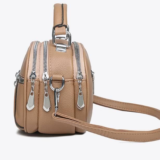 上質な合皮素材を使用しており、手触りが柔らかく高見え効果も抜群。前面のダブルジッパーポケットがデザインのアクセントとなっており、見た目以上の収納力と機能性を両立。肩掛けも手持ちもできる2way仕様で、日常使いから旅行、ショッピングまで幅広く活躍します。