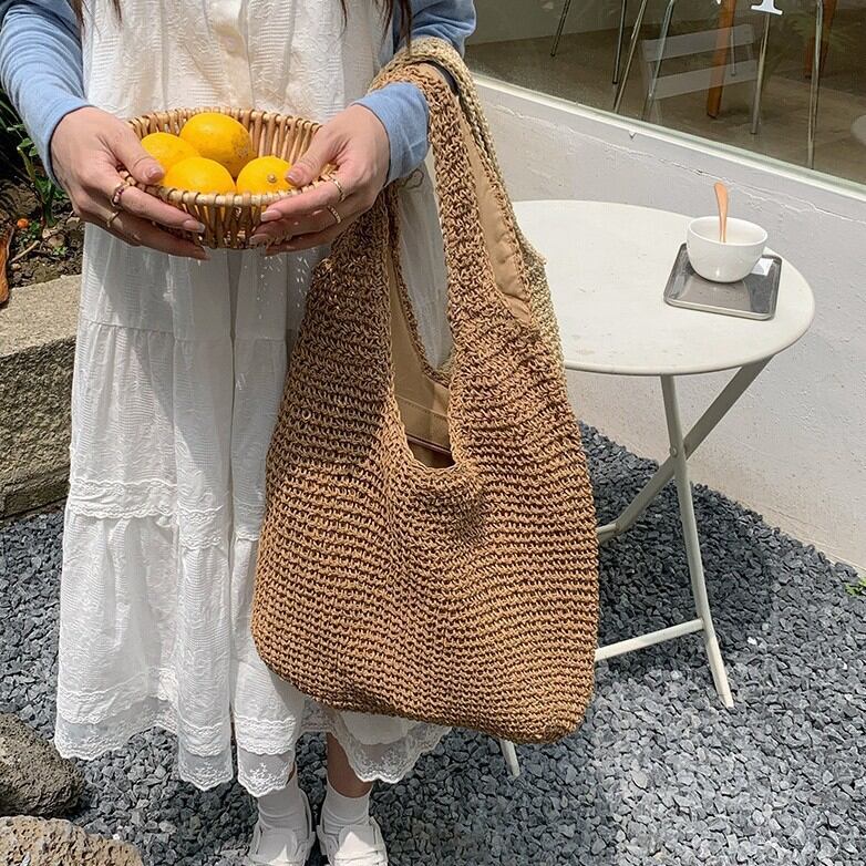 ラフィア風バッグ 編みバッグ かごバッグ レディース 肩掛け 大容量 ナチュラル素材 韓国ファッション 春夏 お出かけ デート コーデ おしゃれ 人気 2色展開 K-B0225