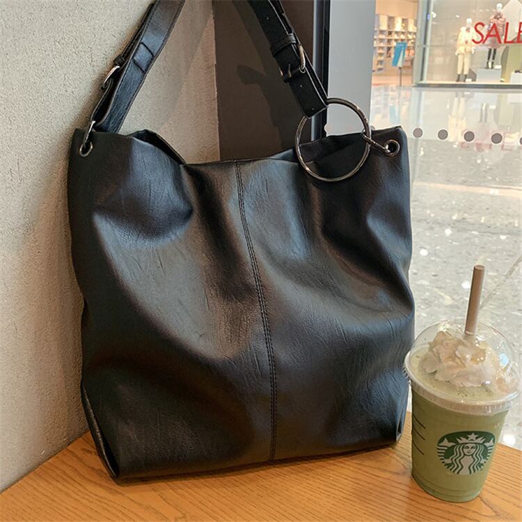 トレンド感と実用性を兼ね備えた、大人の女性にぴったりのレザートートバッグが登場。マットなフェイクレザーの質感が上品さを引き立て、カジュアルなスタイルにもきれいめコーデにもマッチします。大きめのリングパーツがさりげないアクセントになっており、シンプルながらも洗練された印象を演出。
