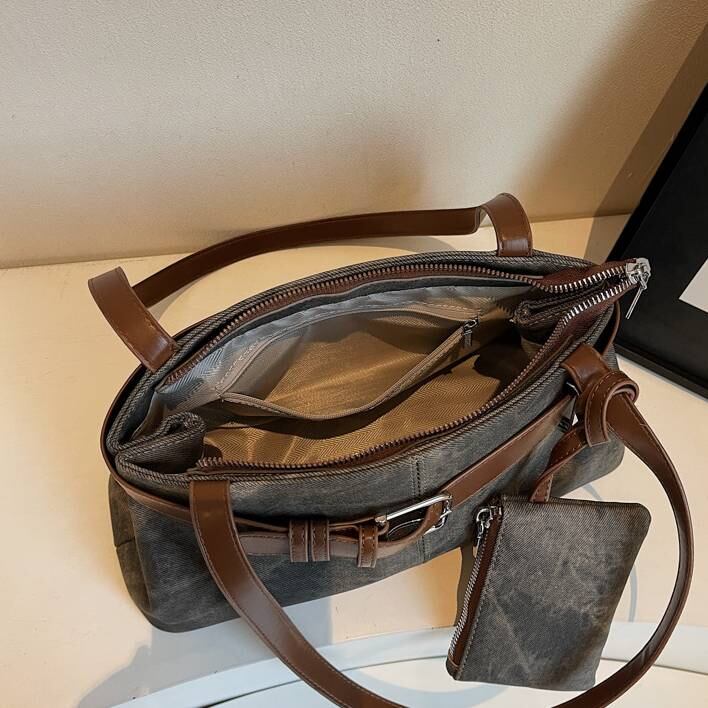 高級感漂うベルトデザインが特徴のレディースショルダーバッグ。しっかりとしたキャンバス素材とブラウンのレザーハンドルが絶妙にマッチし、大人の女性らしい品格を演出してくれます。普段使いから通勤・通学・デートまで幅広いシーンで活躍。取り外し可能なポーチ付きで収納力もバッチリです。
