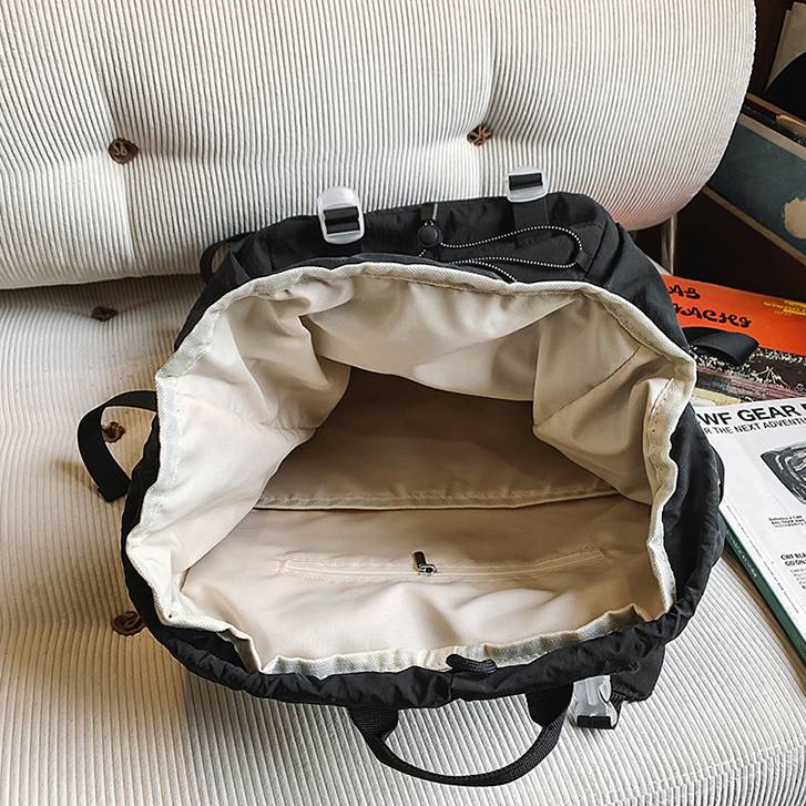 ノート・タブレット・財布・ポーチなど、日常に必要なアイテムをまとめて収納可能。巾着式の開閉に加え、フロントファスナーポケット付きで、小物の出し入れもスムーズです。軽さと実用性を兼ね備えた、使い勝手の良さが魅力です。