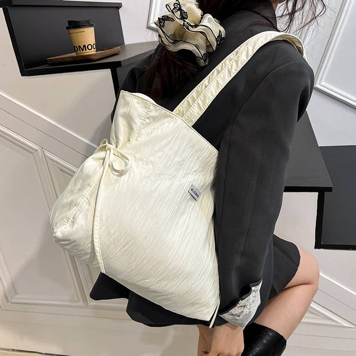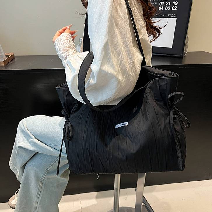サイドのリボンデザインがさりげないアクセントになり、シンプルながらも女性らしさをプラス。ブラック・ピンク・オフホワイト・ホワイトの使いやすいカラー展開で、季節を問わず長く愛用できる万能トートバッグです。
